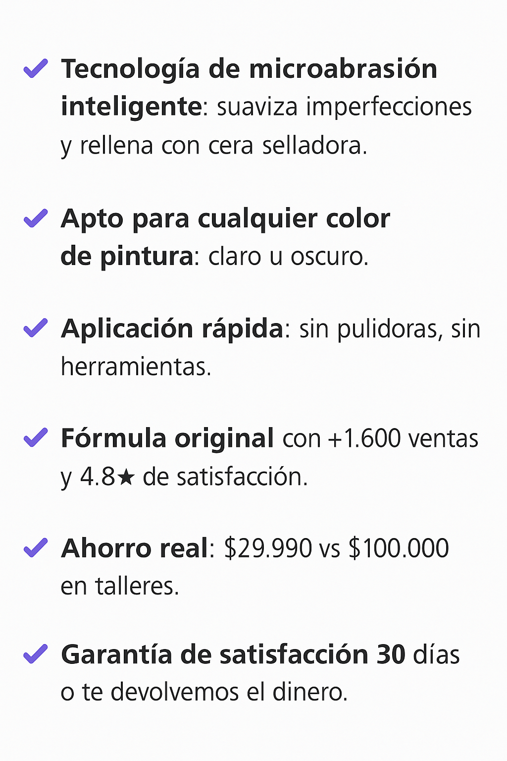 Segura y práctica Nunca había usado nada para el auto, pero esto fue demasiado fácil. Solo lo apliqué, froté con un paño y ¡listo! Mi auto volvió a brillar. Me ahorré una ida al taller y más de $100.000. Funciona de verdad y no necesitas ser experta.